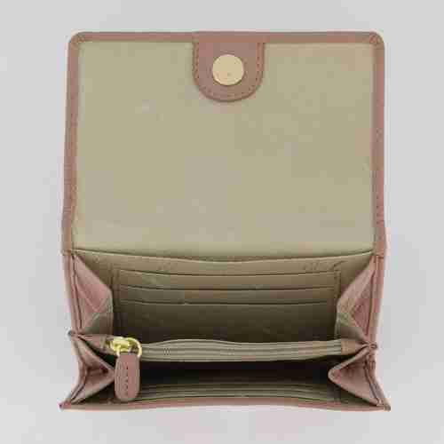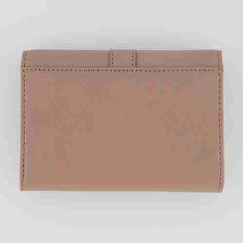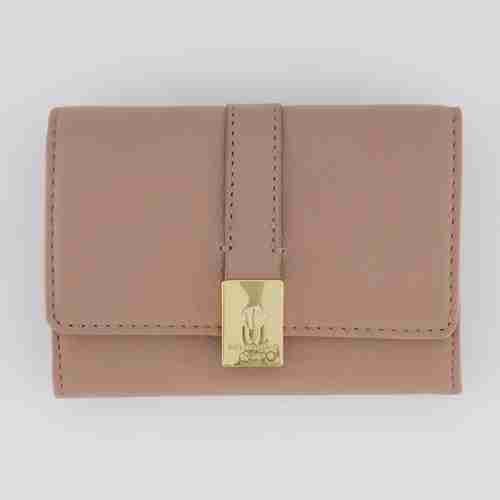 Paul Costelloe leather plaque purse. Pink nude colour, gold branded plaque, four internal pockets, six internal card slots, zipped and buttoned fastenings.