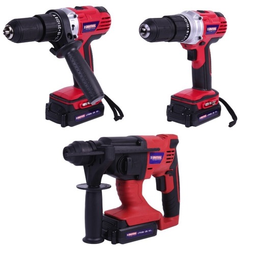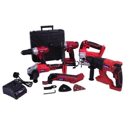 Contents: Combi Drill, Drill Driver, Jigsaw, 4 1/2″ Angle Grinder, SDS Rotary Hammer Drill, Oscillating Multi-Tool, 2Ah Battery, Fast Charger, Combi Drill Side Handle, Hammer Drill Side Handle, Delta Sander, Scraper Blade, E-Cut Blade, Sand Paper and Carry Case.
